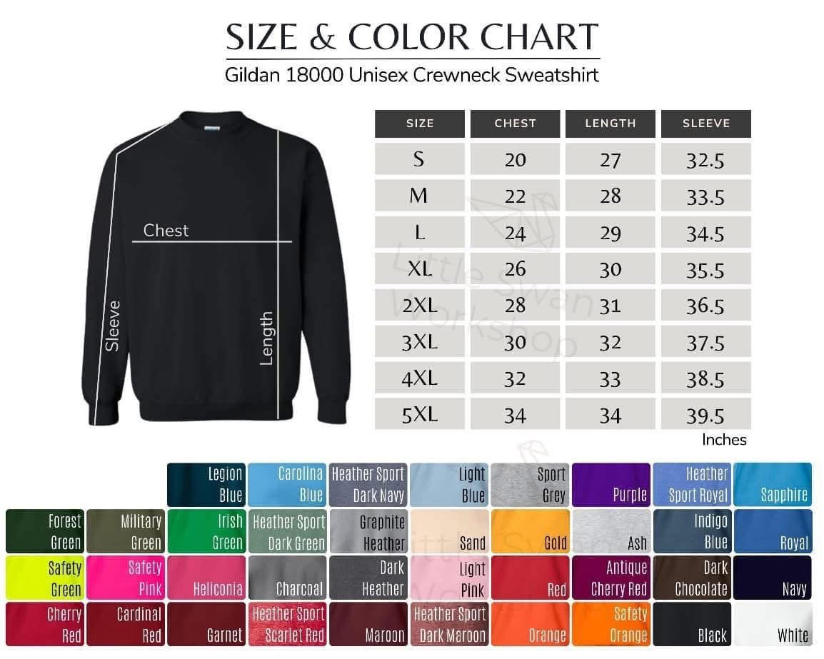 Choose Tshirt (Comfort Color) or Crewneck (Gildan) and size.